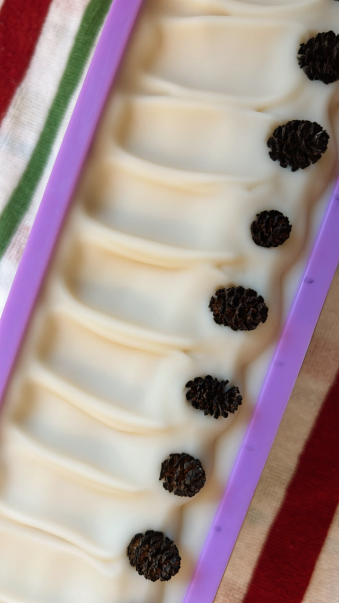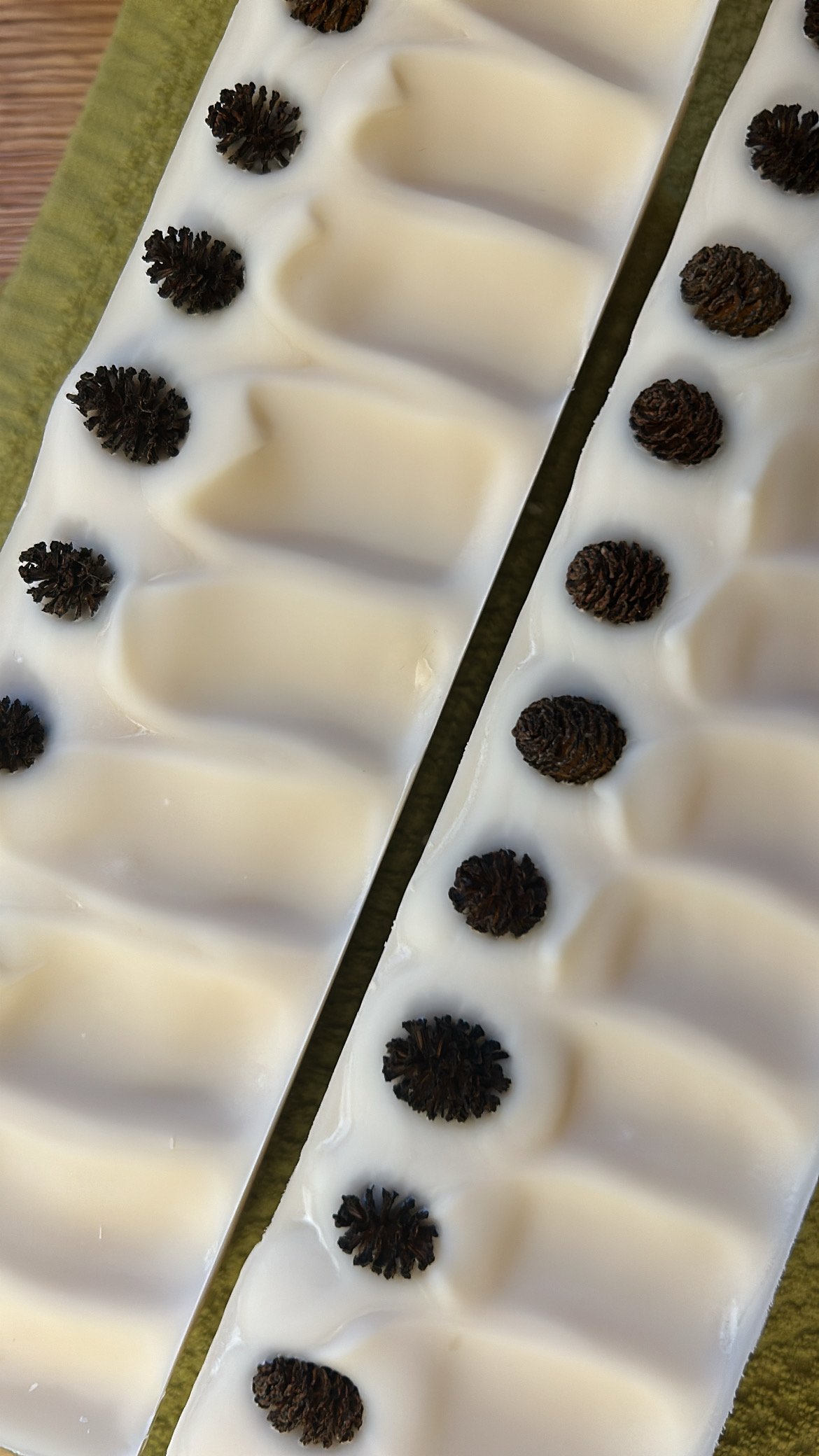 Scented with an essential oil blend of pine needle, tea tree, fir, and lavender it smells like a refreshing morning walk through the woods. Topped with a tiny alder cone foraged by me.