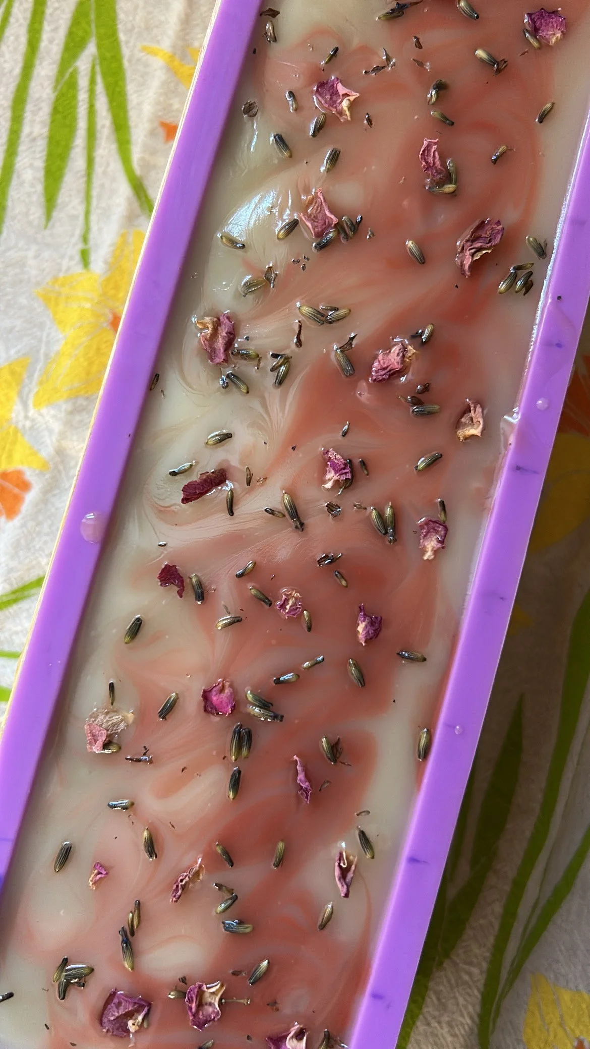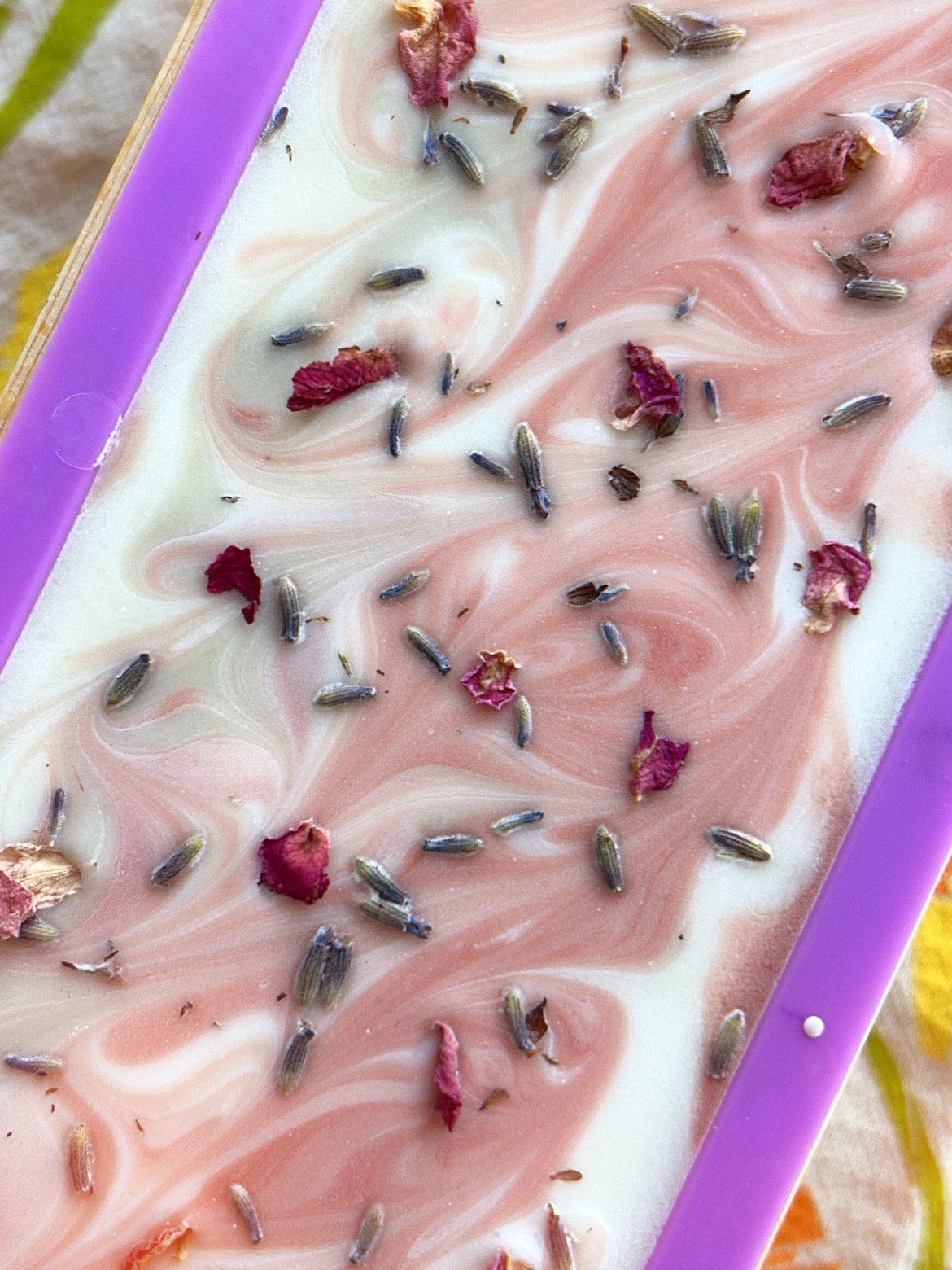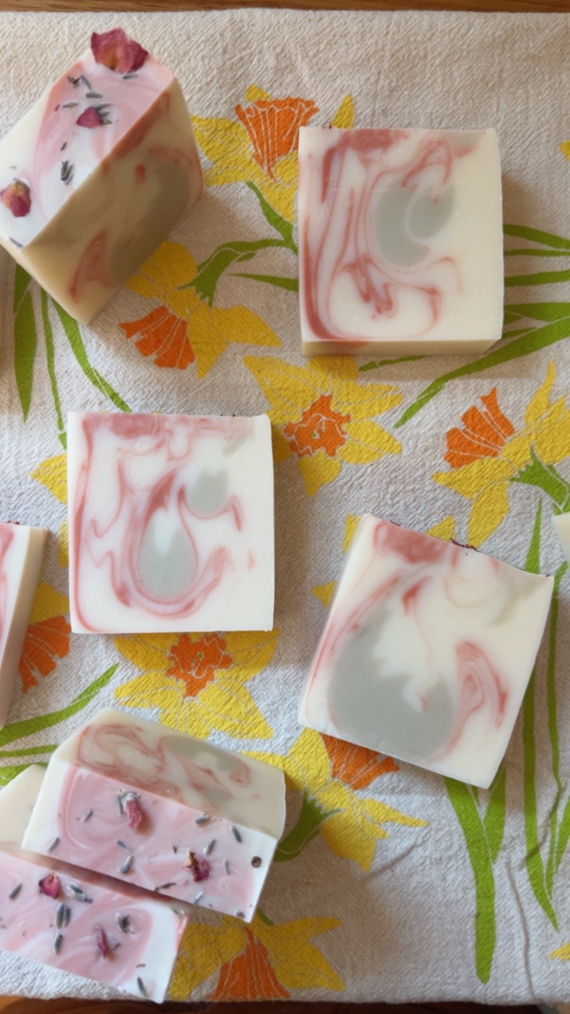Garden Party Soap is naturally colored with swirls of Rose Kaolin clay and French Green Clay. These clays can help clean pores, absorb excess oils, reduce fine lines/ wrinkles, and exfoliate dead skin cells for a bright complexion. This soap also contains Shea butter and tallow to help moisturize the skin.
