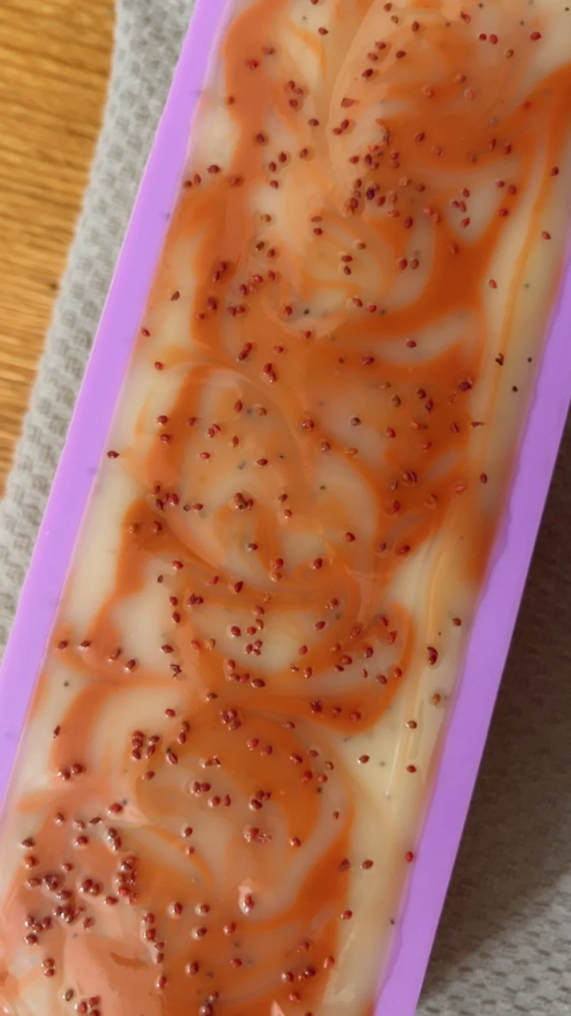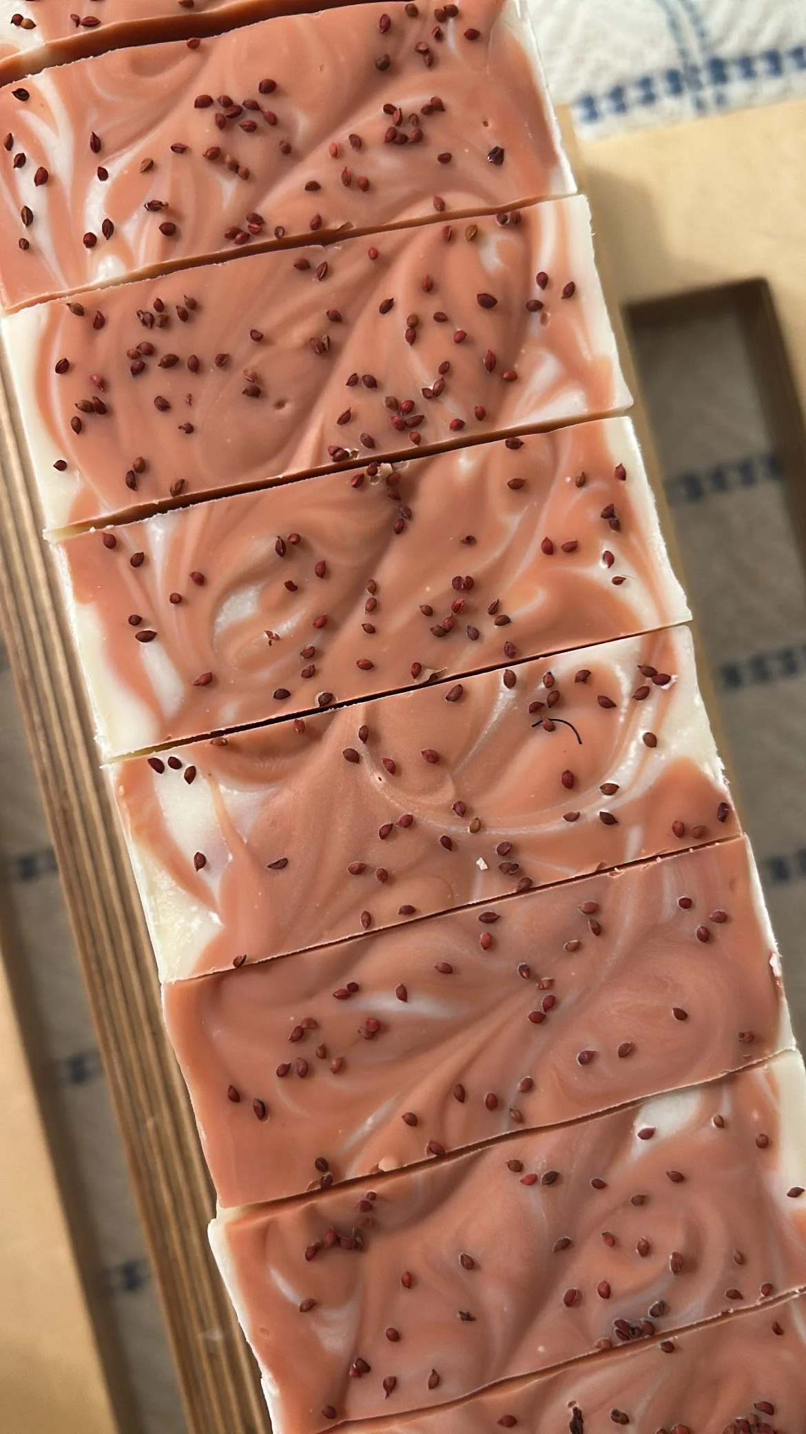 Holiday Cheer soap is naturally colored with a red Moroccan clay swirl and topped with cranberry seeds. Red Moroccan clay’s high ion exchange draws out toxins, dirt, and excess oils from the pores and it also had mild abrasive texture for exfoliating off dead skin cells.