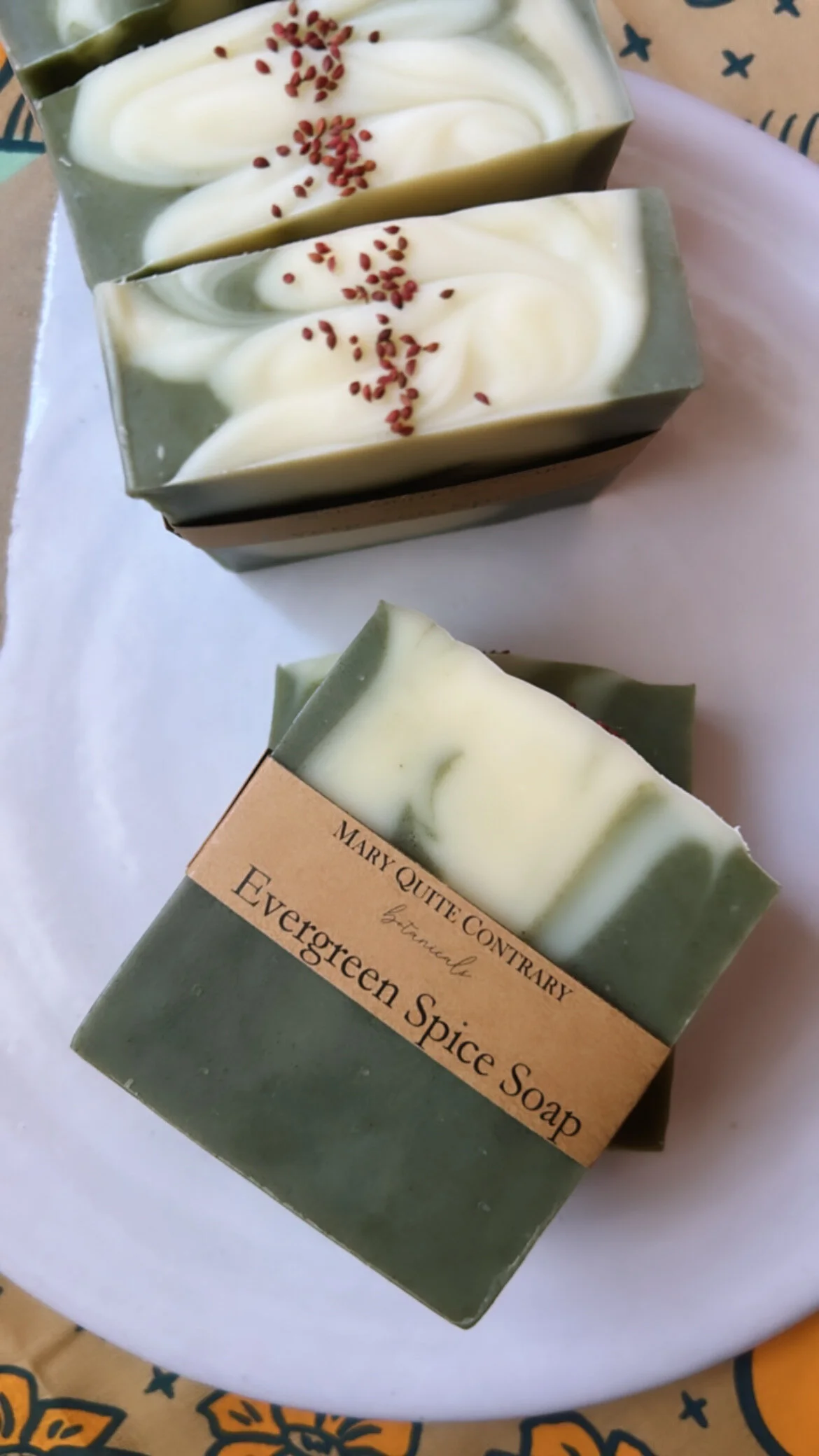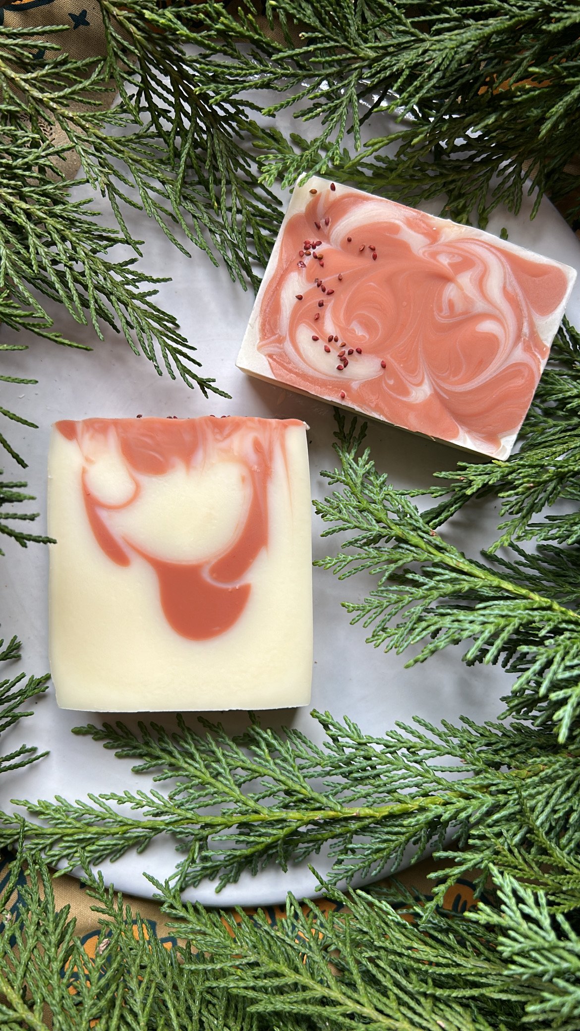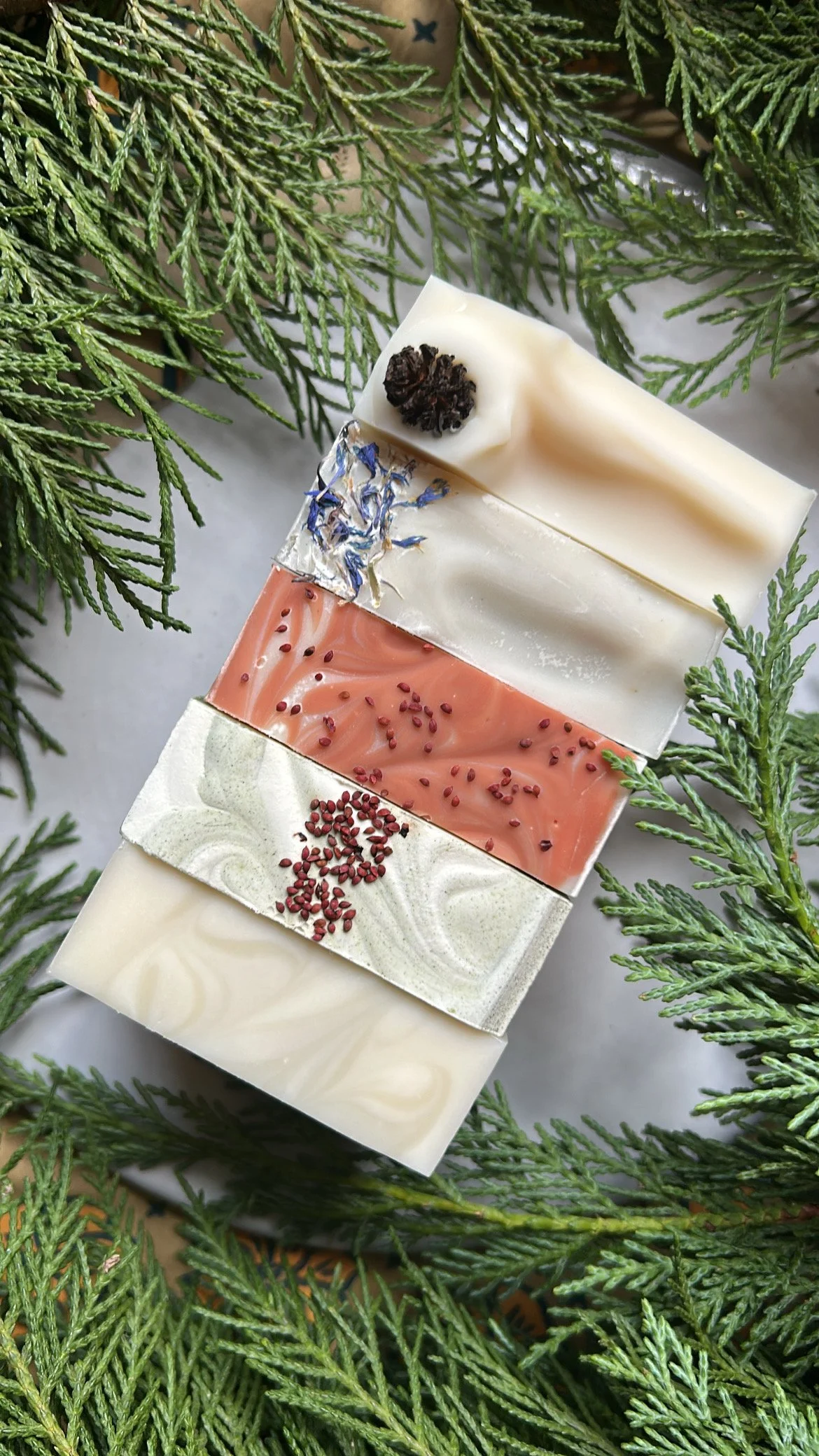 Includes a large 5.5 oz bar of each soap from the Winter Collection: Alpine, Evergreen Spice, Frost, Holiday Cheer, and Winter Solstice. All of the soaps use natural colorants and ingredients and only use essential oils for fragrance.