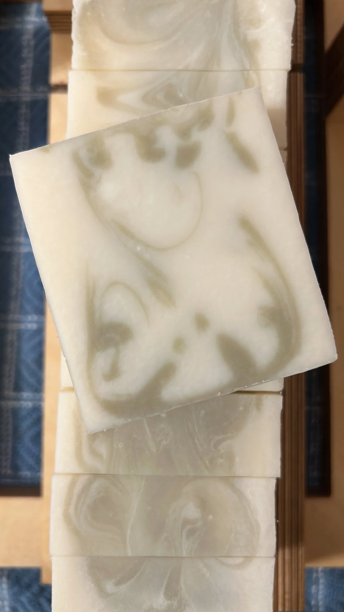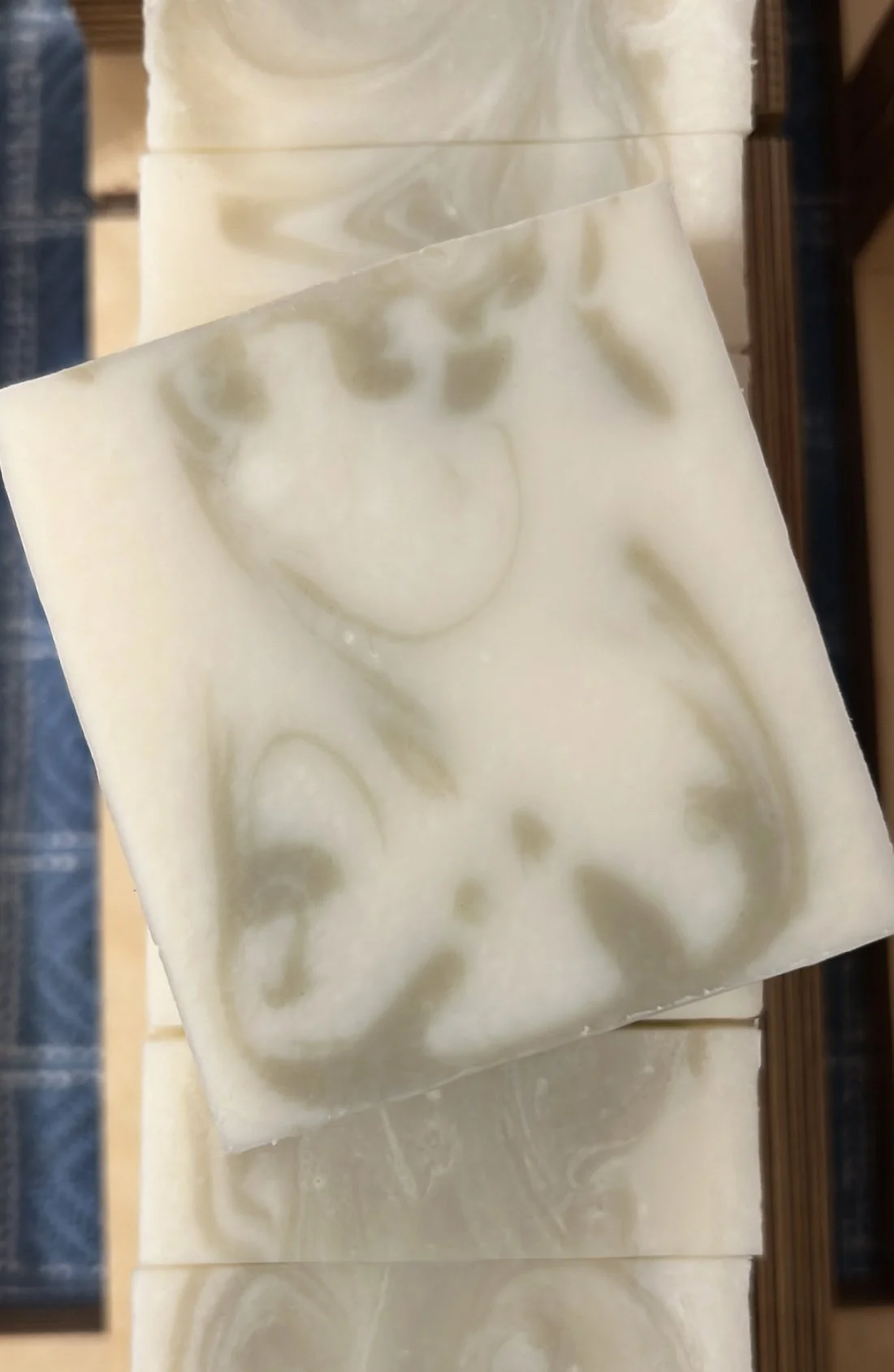 A mostly white soap bar with a touch of French Green Clay for skin soothing and cleansing properties.